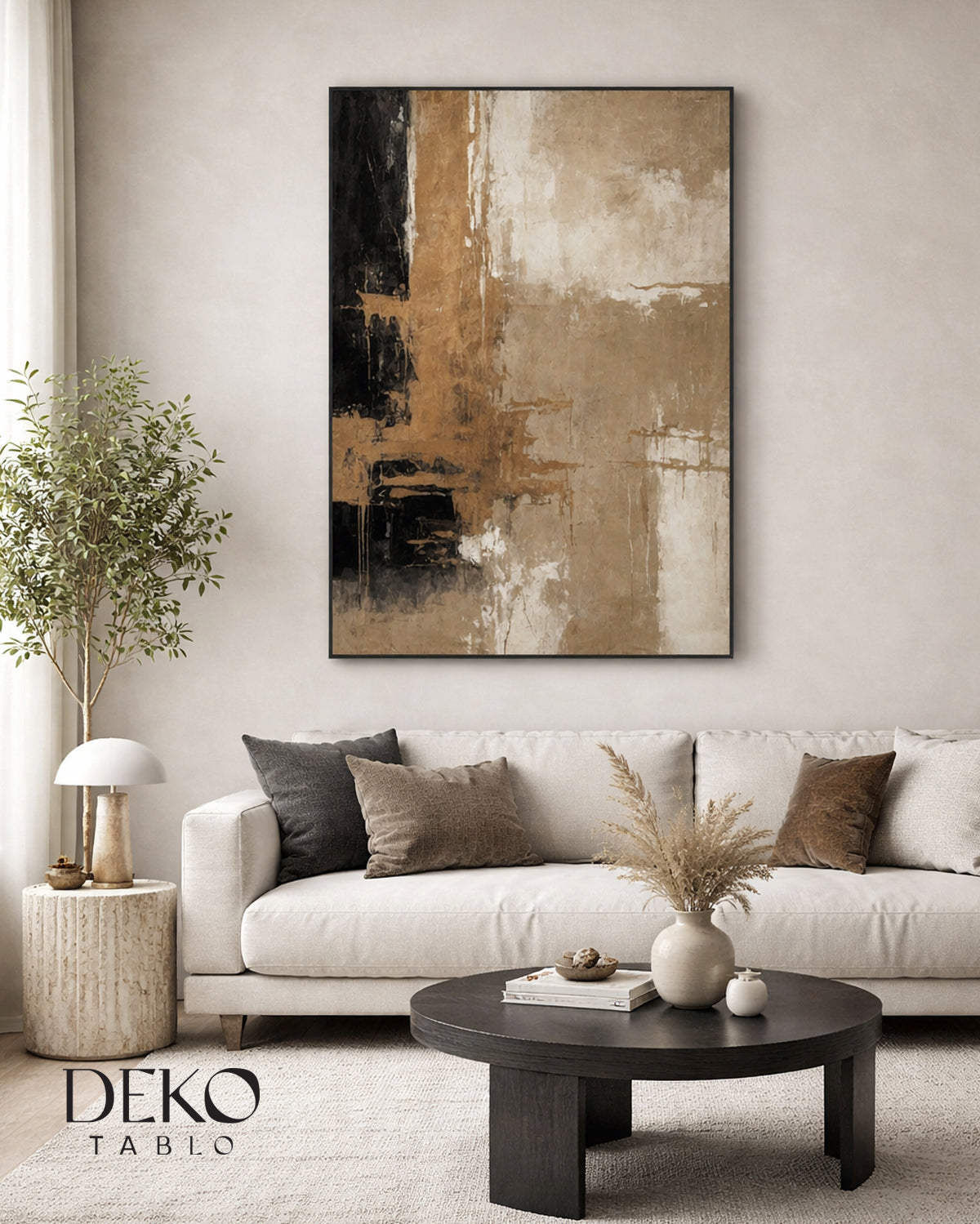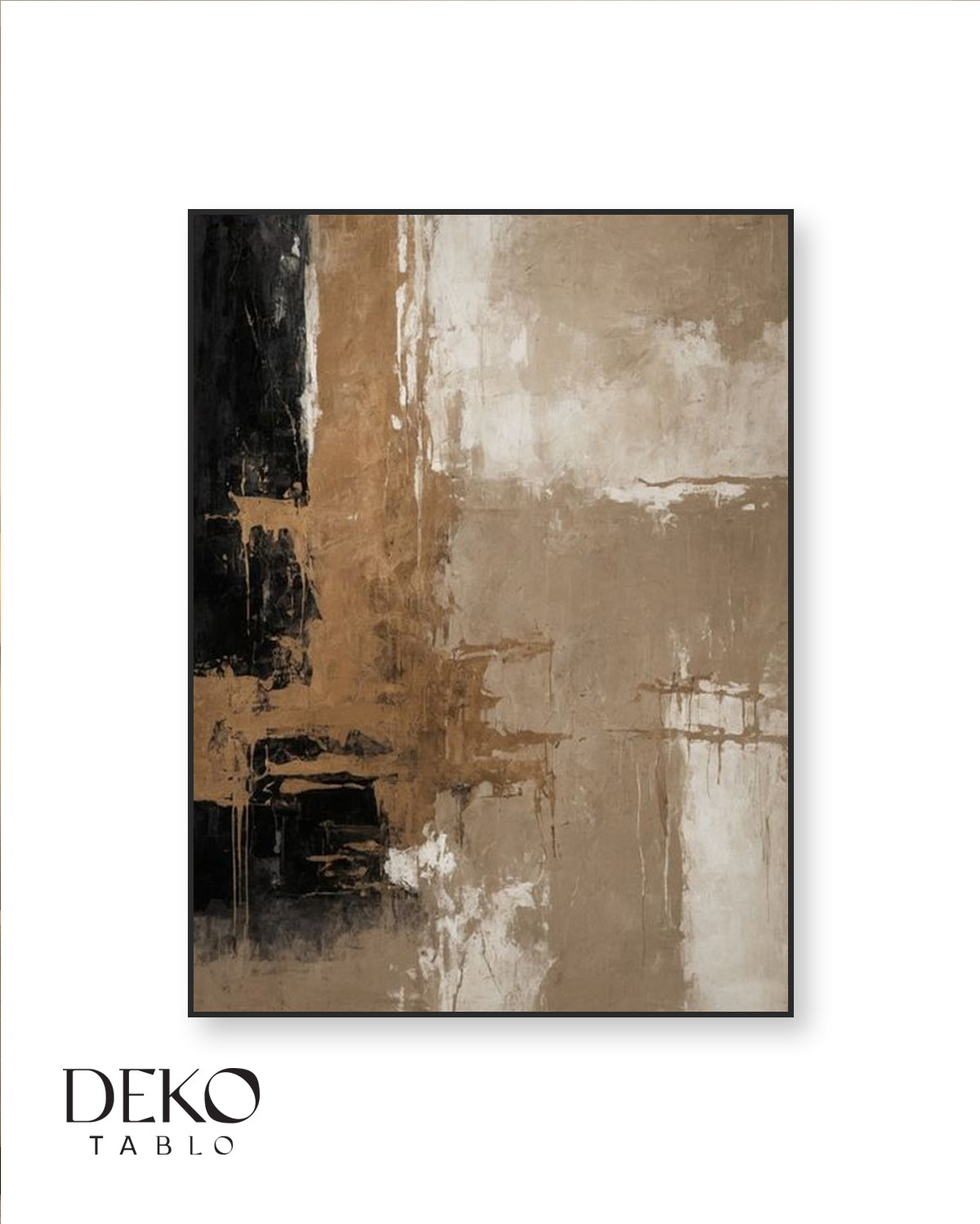"Düzlem" Kahve Bej ve Siyah Detaylı Soyut Yağlı Boya Tablo