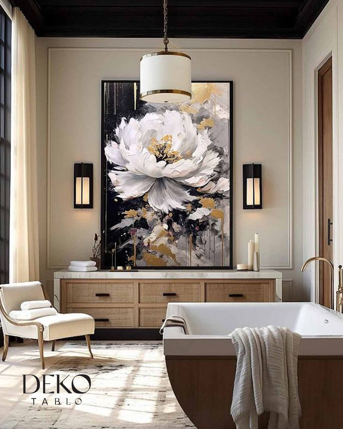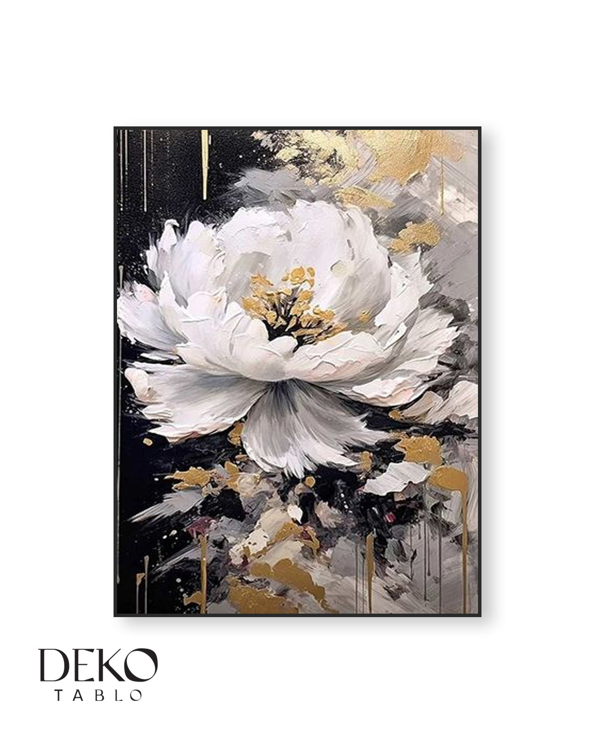 "Geceye Açan İnci" Altın Siyah Beyaz Gri Detaylı Yağlı Boya Tablo